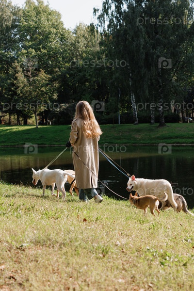Медсестра гуляет с собаками в парке у озера. концепция дружбы, питомца, отдыха