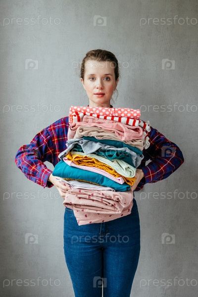 Счастливая молодая европейская женщина хранит дома кучу сложенной одежды для гигиенической стирки