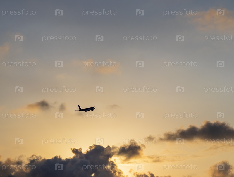 Самолет, который только что поднялся в прекрасное заходящее солнце небо