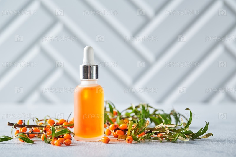 Стеклянная бутылка с маслом морского гречневого терна, ягодами и ветвями грецкого терна на светлом фоне. Самообслуживание, косметика, косметические практики, концепция самообслуживания