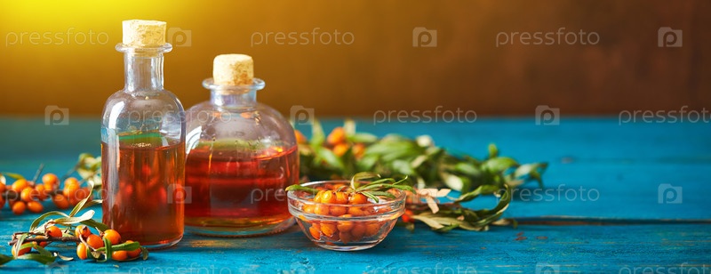 Стеклянная бутылка с ягодами морского гречневого масла и ветвями грецкого терна на деревянном фоне. длинный широкий баннер