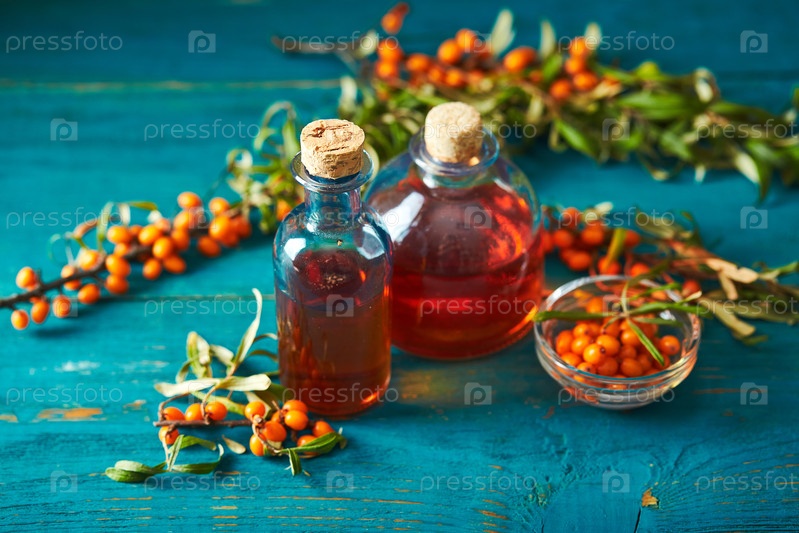 Стеклянная бутылка с ягодами морского гречневого масла и ветвями грецкого терна на деревянном фоне
