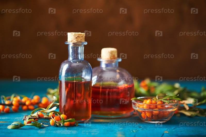 Стеклянная бутылка с ягодами морского гречневого масла и ветвями грецкого терна на деревянном фоне