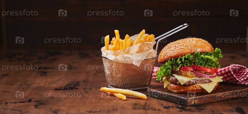 Самодельный бургер с говядиной, сыром и мармелад из лука на деревянном доске, картофель фри в металлической корзине