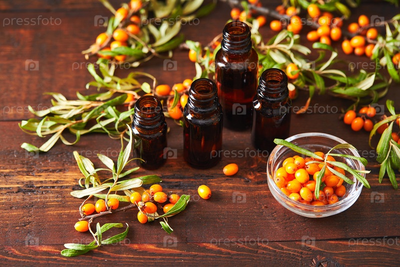 Стеклянная бутылка с ягодами морского гречневого масла и ветвями грецкого терна на деревянном фоне
