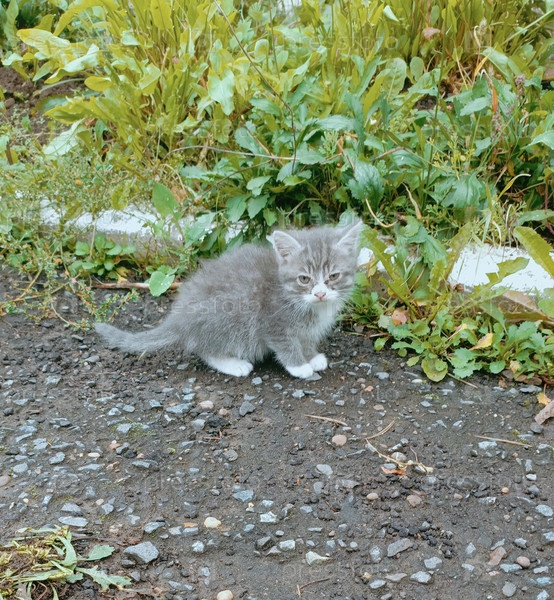 Серое котенок с мрачным взглядом сидит на тропинке на краю сада