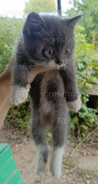 Серо-белый котенок с любопытным настроением, нежно удерживаемый на фоне мягкого наружного зелени