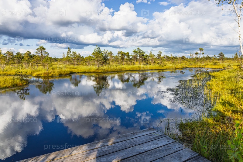 Живая водно-болотная сцена с деревянной набережной, тихим торфяным болотистым бассейном и драматическими облачными отражениями