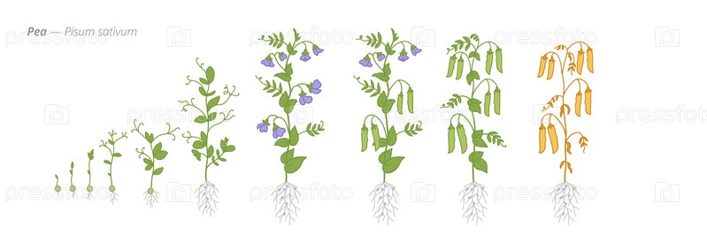 Это визуальное изображение демонстрирует цикл роста гороха от семян до зрелых сушеных вершин, подчеркивая ключевые этапы развития для успешного выращивания