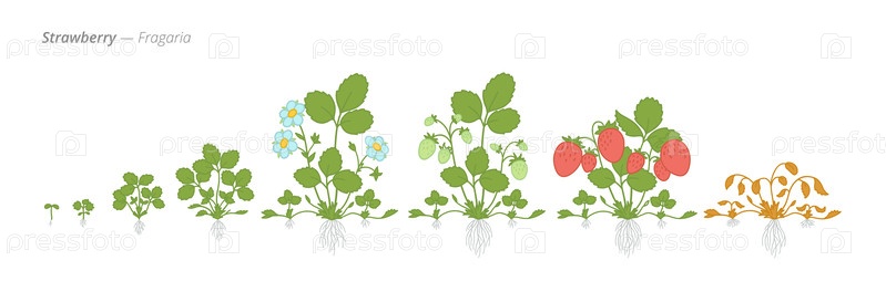 Ботанические иллюстрации изображают стадии роста клубниковых растений от семян до спелых плодов, подчеркивая ключевые моменты развития для эффективного выращивания