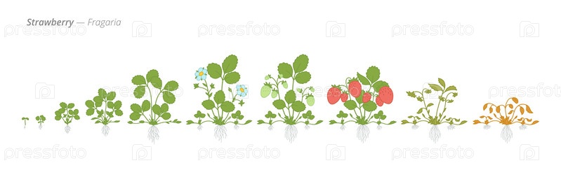 Высококачественная векторная иллюстрация стадий роста клубники от семян до плодов, идеально подходит для агробизнеса, садоводства и образовательных материалов