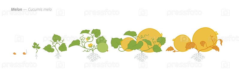 Ботанически точная векторная иллюстрация стадий роста дыни от семян до спелых плодов, адаптированная для использования в сельском хозяйстве при планировании орошения и удобрения