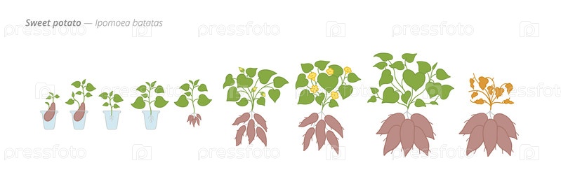 Ботанически точная векторная иллюстрация стадий роста сладкого картофеля от побега до урожая, адаптированная для использования в сельском хозяйстве при планировании орошения и удобрения