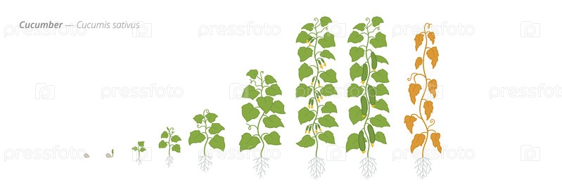 На иллюстрации показаны этапы прорастания огурцов, их рост и высыхание для лучшего садоводства