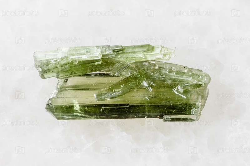 Образец сырых кристаллов зоизита на белом мраморе