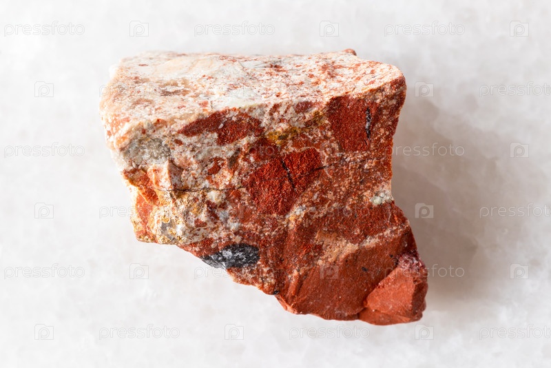 Образец сырой красной ясписовой породы на белом мраморе