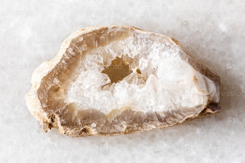 Необработанный слой заполненной кварцем геоды на белом мраморе
