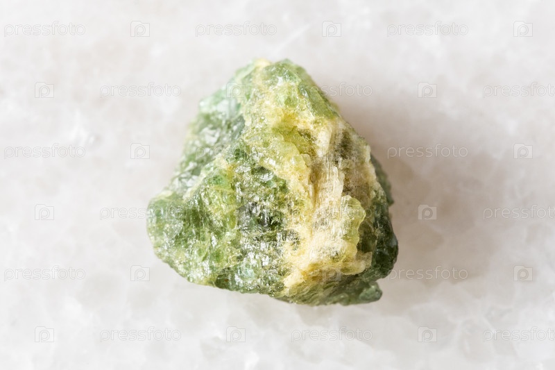 Грубый жёлто-зеленый бериловый минерал на белом мраморе