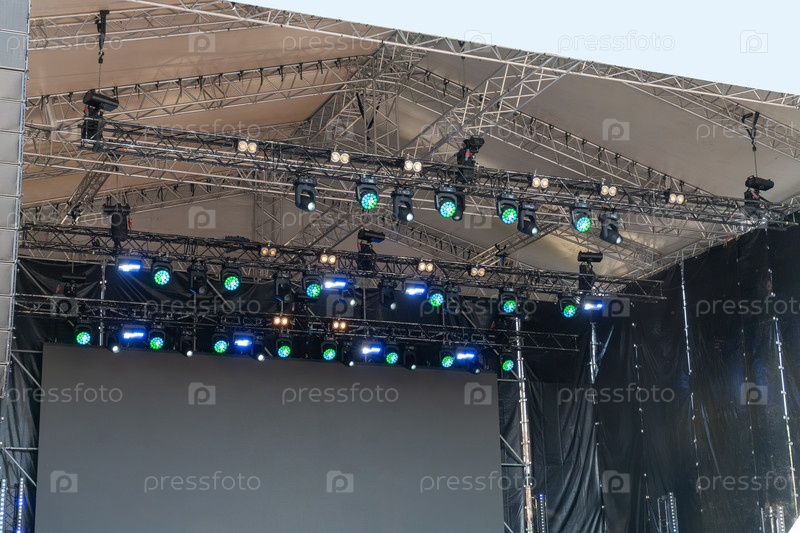 Современное светодиодное и лазерное осветительное оборудование освещает открытую концертную сцену во время музыкального представления, создавая яркое световое шоу