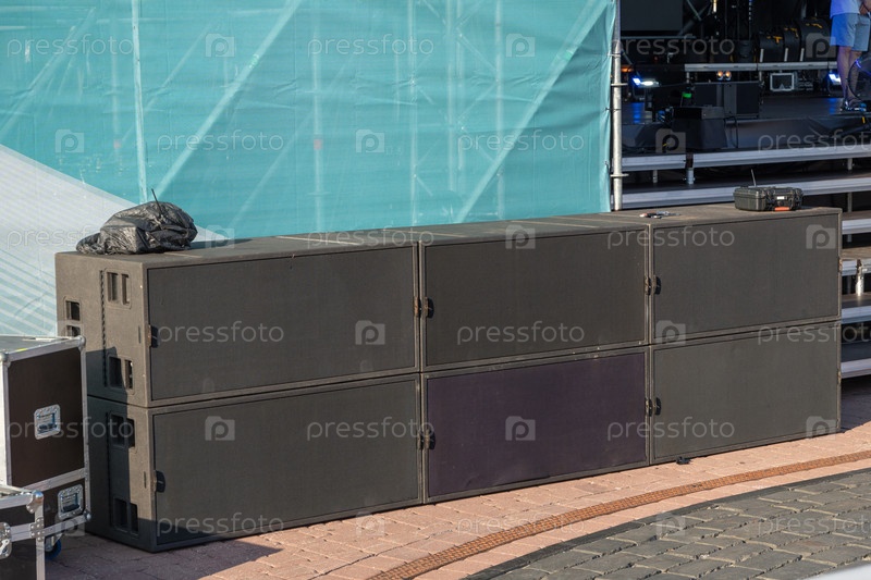 Мощная аудиосистема для концертов на открытом воздухе с большими динамиками в передней части сцены для исполнения живой музыки