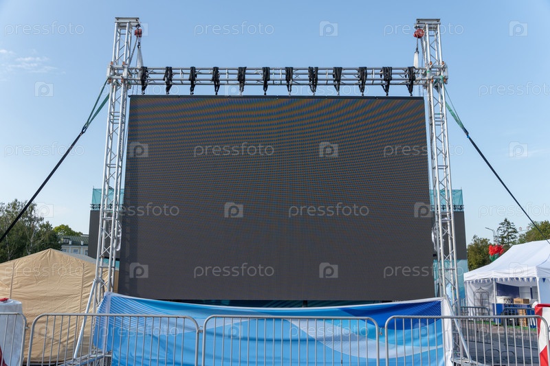 Большой светодиодный экран, отображающий сценическое представление для дальних посетителей концерта на темной арене