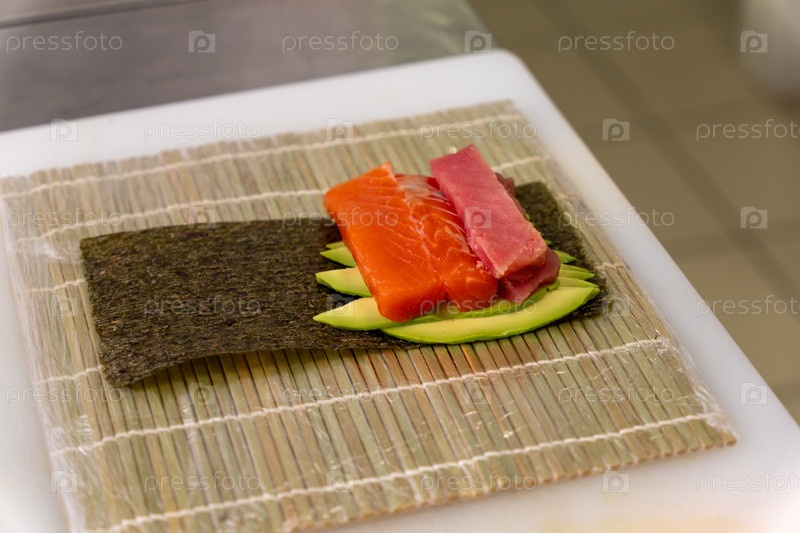 Свежеприготовленный суши-ролл с лососем, тунцом и авокадо готов к закату