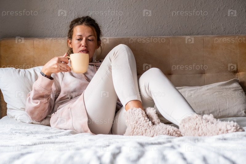 Женщина отдыхает в постели с чашечкой кофе в уютном наряде и пушистых тапочках