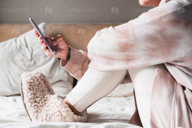Женщина в удобной одежде использует смартфон, сидя на кровати