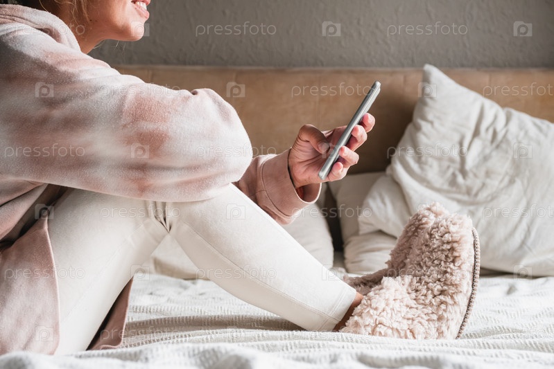 Женщина в удобной одежде использует смартфон, сидя на кровати