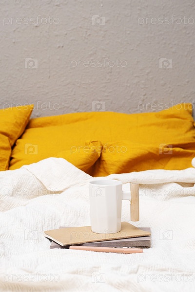 Уютная кровать с желтыми подушками, блокнотом, ручкой и кофейной кружкой