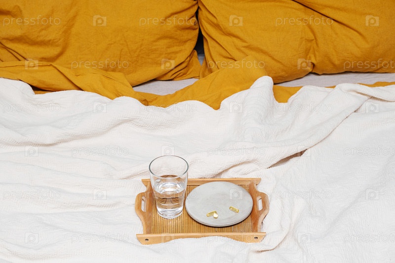 Стеклянки с водой и витаминные капсулы помещают на кровать