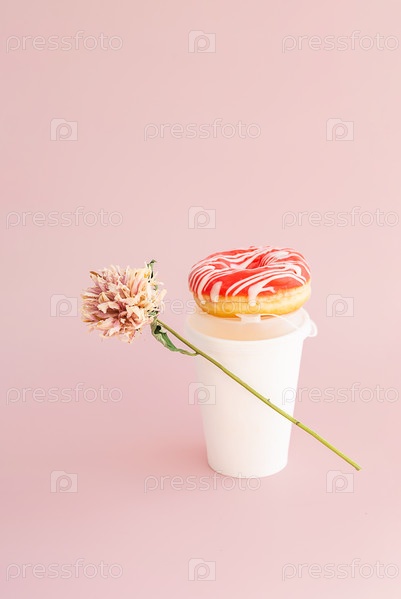 Сушеный цветочный пончик и бумажная чашка с кофе на розовом фоне