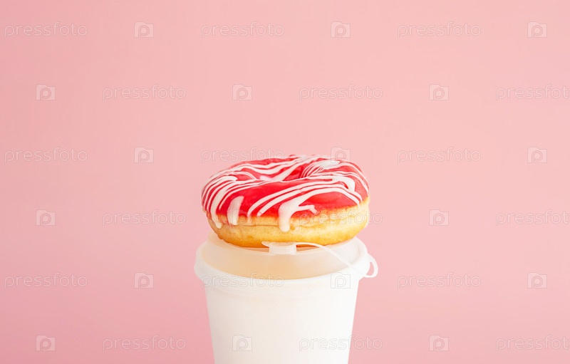 пончик с розовой глазурью и белыми полосками, лежащий на чашке кофе