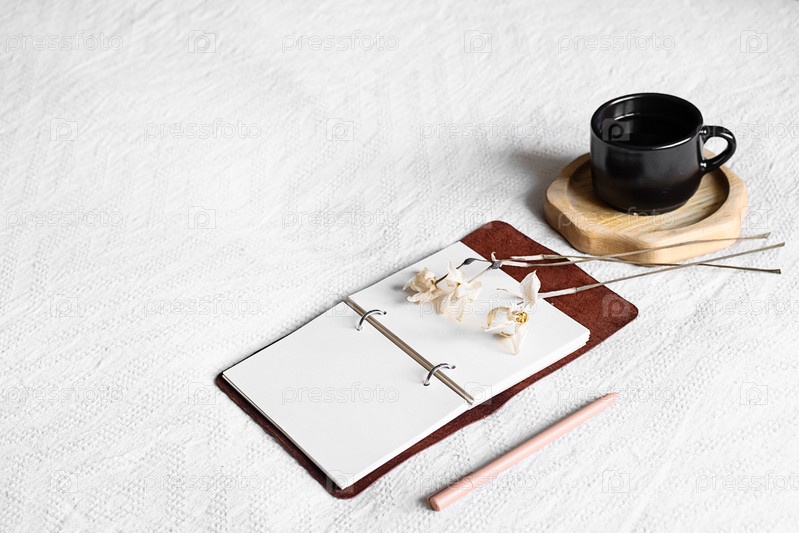 Полные страницы тетради и чашки кофе