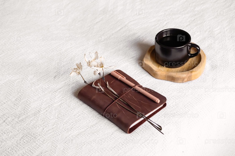 Ноутбук и чашка кофе на белом одеяле