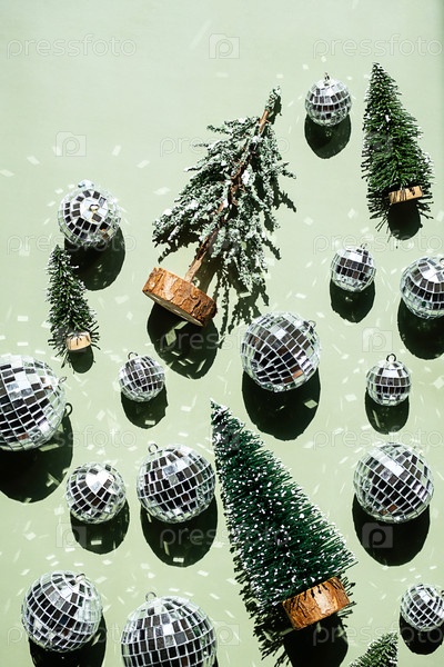 Зеленый фон с искусственными рождественскими елками и множеством блестящих диско балов