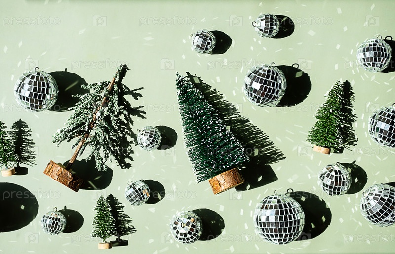 Зеленый фон с искусственными рождественскими елками и множеством блестящих диско балов