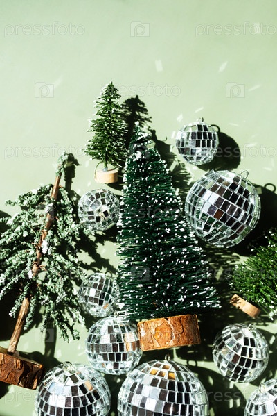 Мини-рождественские елки и дискотечные шары на зеленом фоне. концепция праздника
