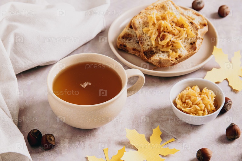 Чашка чая и осенний тост с яблочным вареной на тарелке на столе