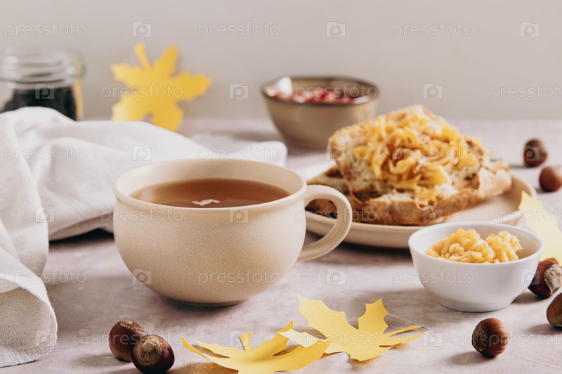 Осенний чай в чашке с яблочными кортунами на тарелке на столе