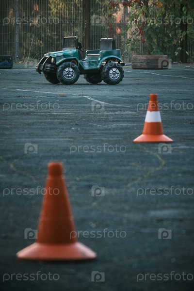 Детская тренировочная зона, игрушечный автомобиль, конусы, день, осень