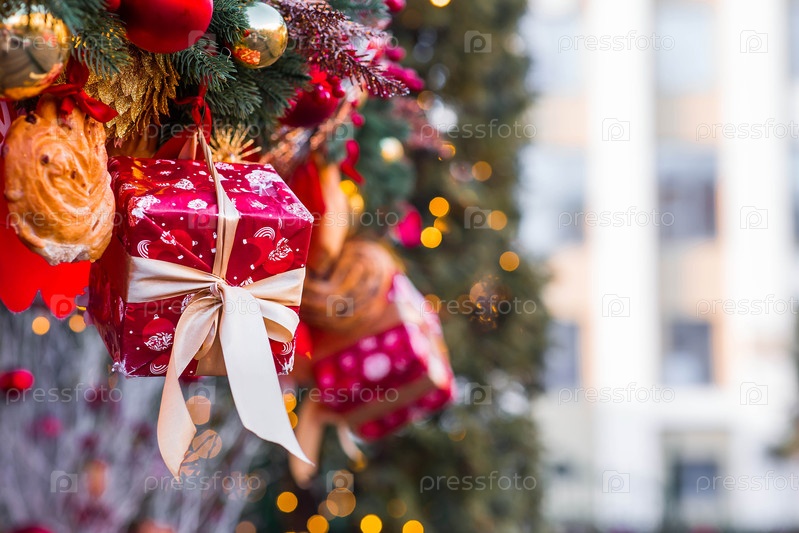 Покупка подарков для семьи и друзей. Праздничные игрушки и коробки с подарками на рождественской елке в Москве. Концепция дизайна. Новогодняя открытка 2026