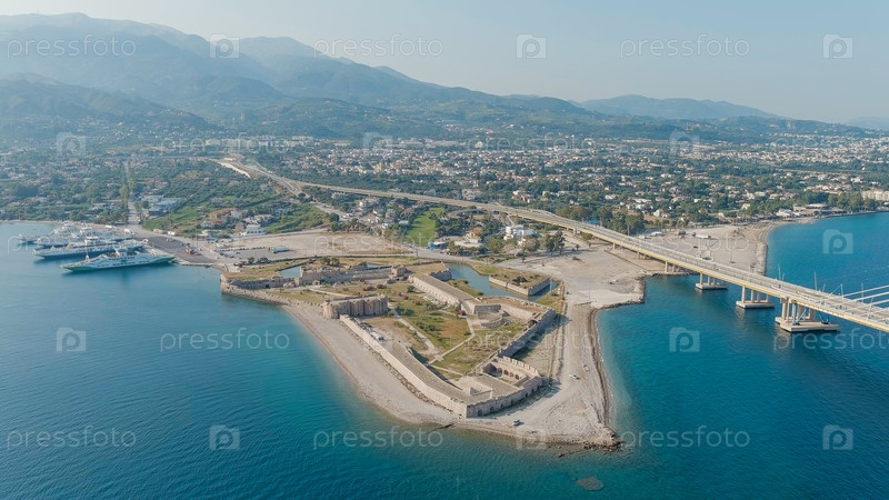 Патрасы, Греция. Крепость Рио. Мост Рио-Антиррио. Официально это мост Харилаос Трикупис. Мост через залив Коринф (маршрут Риона и Андриона), взгляд с воздуха