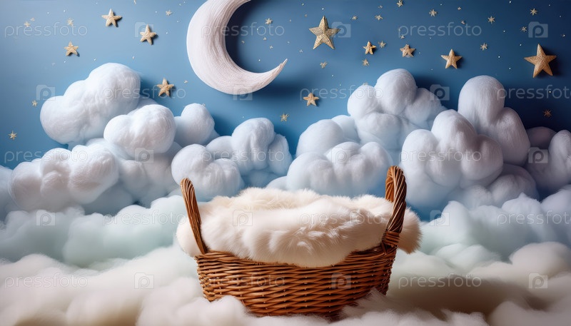 Странная детская корзина на мягких облаках с луной и звездами в сказочной детской сцене мира и воображения