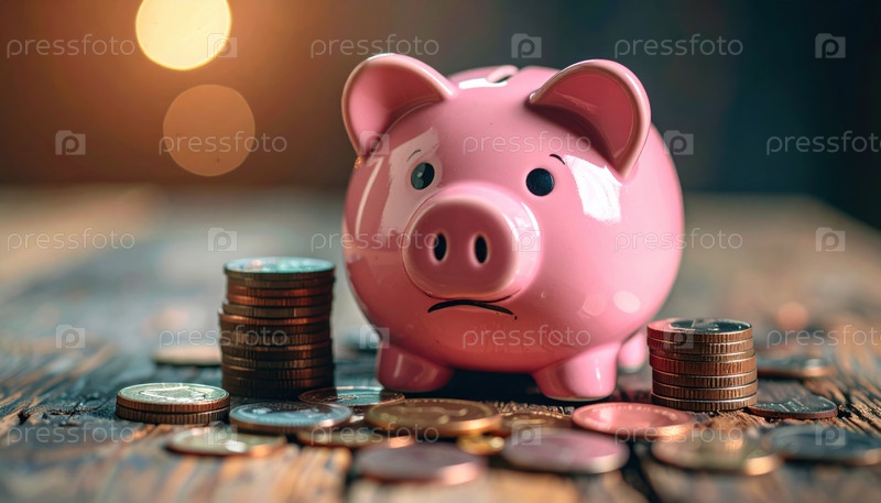 Розовый кошелек в окружении монет на деревянной поверхности изображает концепции экономики, финансов и личного бюджетирования