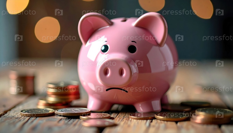 Печальный кошелек среди разбросанных монет, представляющий финансовую борьбу, экономический спад или бюджетную осведомленность
