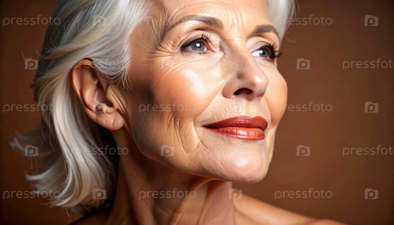 Портрет элегантной пожилой женщины с серебристыми волосами и стильным макияжем Моха Мусс выглядит спокойно