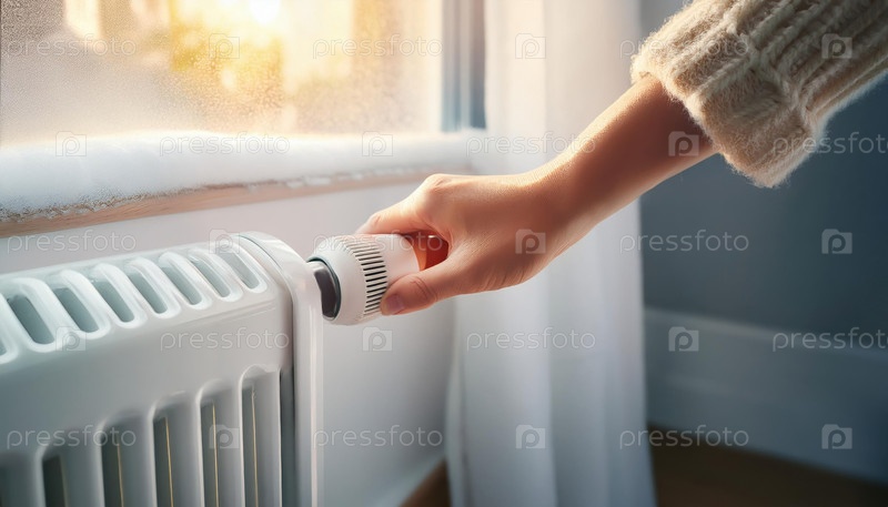 Рука регулирует термостат радиатора, что отражает экономию энергии, устойчивое отопление и личный комфорт в зимний сезон