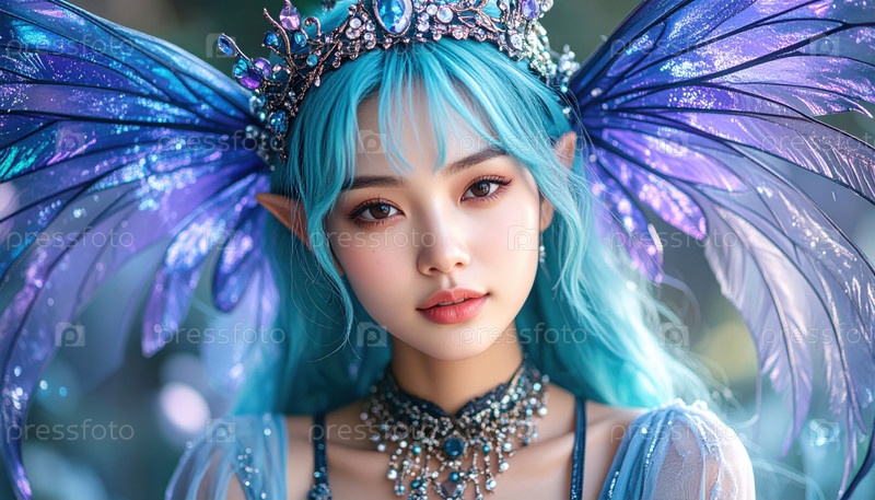 Фантастическая фея с голубыми волосами и искрящимися крыльями в украшенных драгоценностях в волшебном лесу