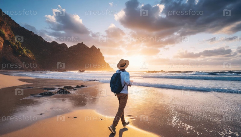 Путешественник гуляет по тихому пляжу в золотое время суток, пробуждая страсть к странствиям, мечты о закате и мирный ритм сольного исследования